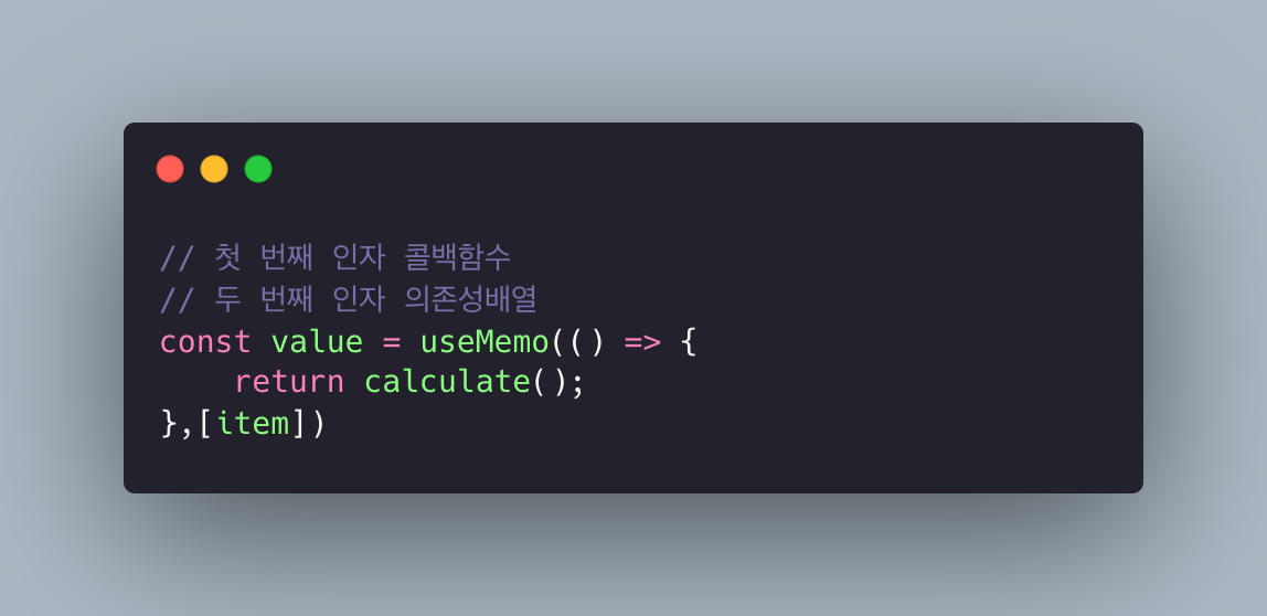 useMemo는 useEffect처럼 첫 번째 인자로 콜백 함수, 두 번째 인자로 의존성 배열(dependancyArray)을 받습니다.