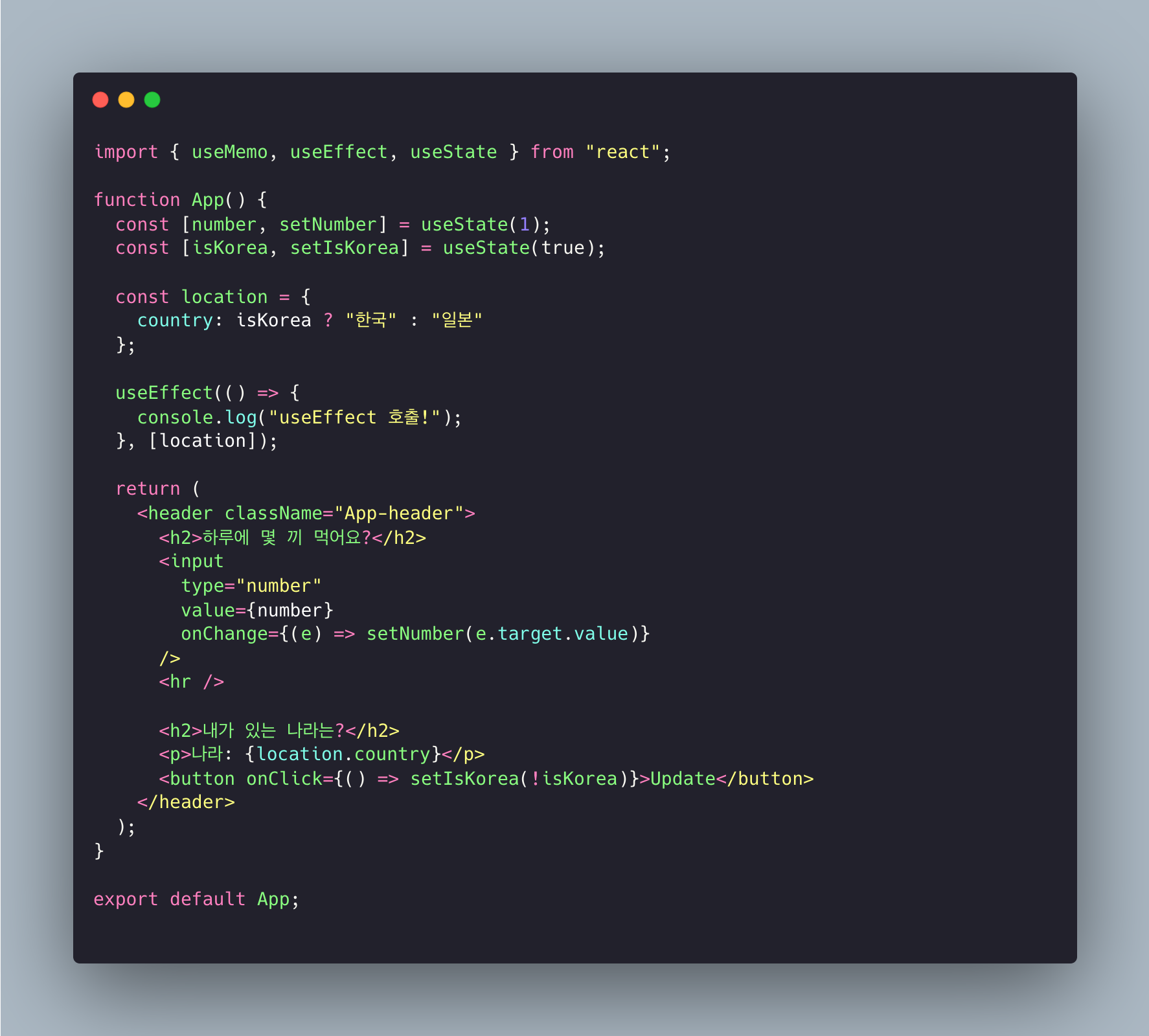 그렇기 때문에 리액트에선 number state가 바뀌면 App 컴포넌트가 재호출되면서 location의 주소값이 변경이 되었기 때문에 location이 변경이 되었다고 인식을 합니다.